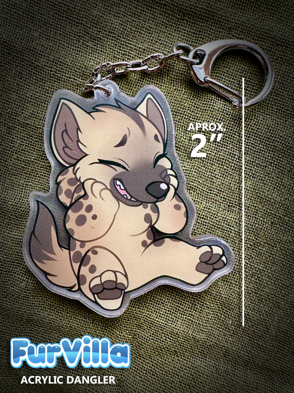 This acrylic dangler features art by Furvilla artist, Kiwi! It is approximately 2" tall, and has a metal chain clasp, making it perfect to hang on your backpack, keys or convention lanyard.