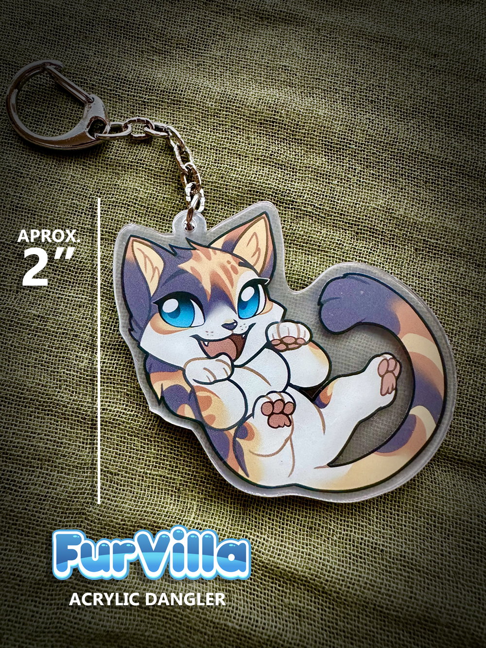 This acrylic dangler features art by Furvilla artist, Kiwi! It is approximately 2" tall, and has a metal chain clasp, making it perfect to hang on your backpack, keys or convention lanyard.